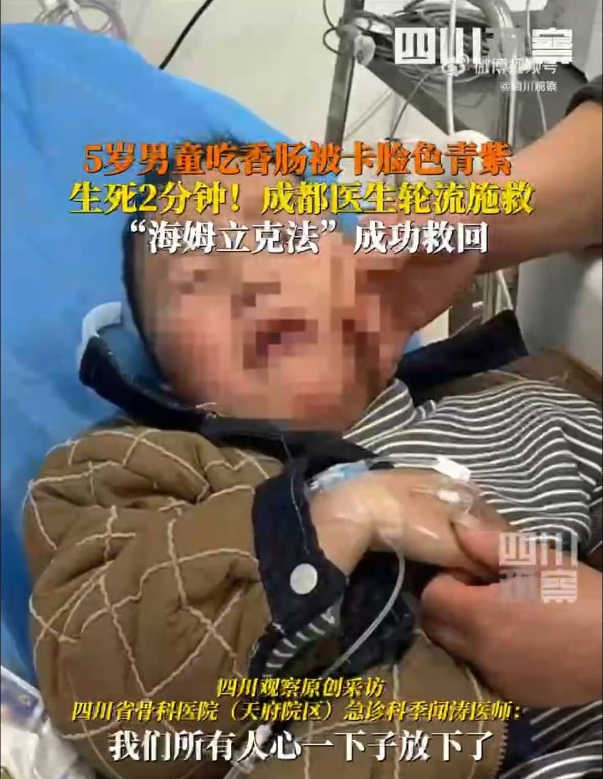 2月18日,5岁男童吃香肠卡喉脸色青紫,医生轮番海姆立克2分钟抢救成功。医生:孩子当时脸色口唇青紫已无意识,应用海姆立克急救法约两分钟后哭出声。