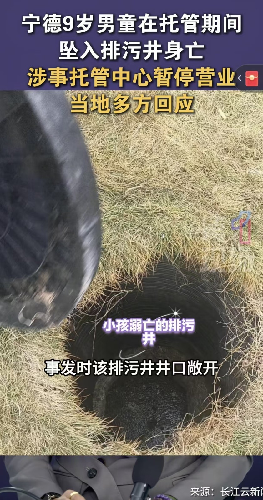 近日福建宁德发生一起令人痛心的儿童安全事故:一名9岁男童在托管期间于托管中心附近活动时,不慎坠入排污井。画面信息显示该排污井约3米深,井口处于敞开状态,周边未见明显围挡或警示设施。事发后相关部门介入处置,涉事托管中心已暂停营业,家属报警并等待进一步调查结果。