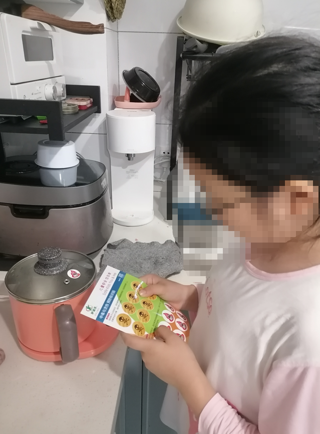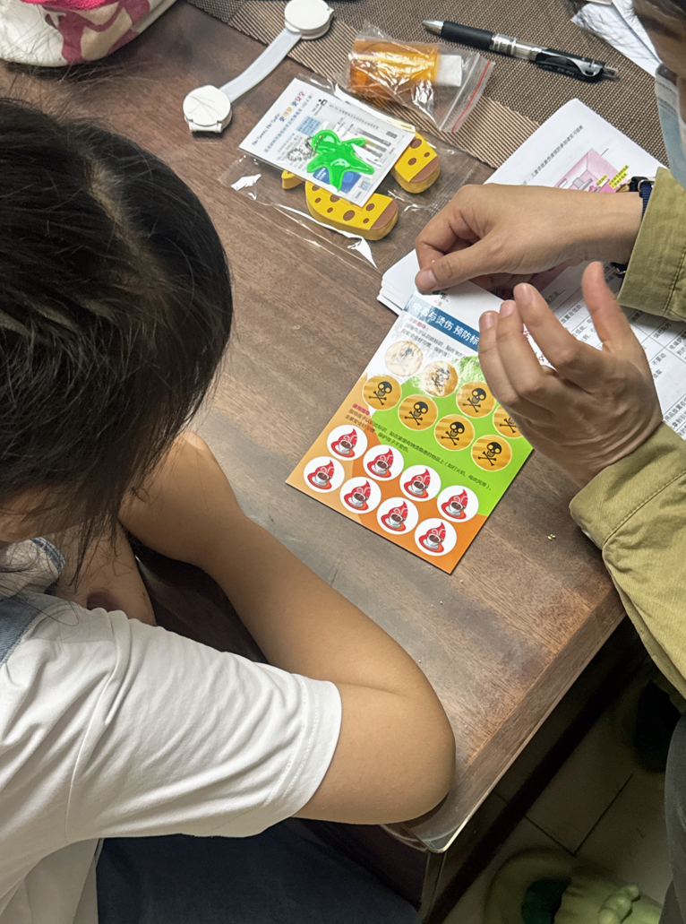实操性环境改善: 在识别出危险区域后,黄老师立即带领家庭成员动手干预,对已排查出的危险之处贴标识,例如在易烫伤处和有毒物品柜张贴醒目的安全警示标识。这一行动直接将理论知识转化为可视化的、具体的防护措施。