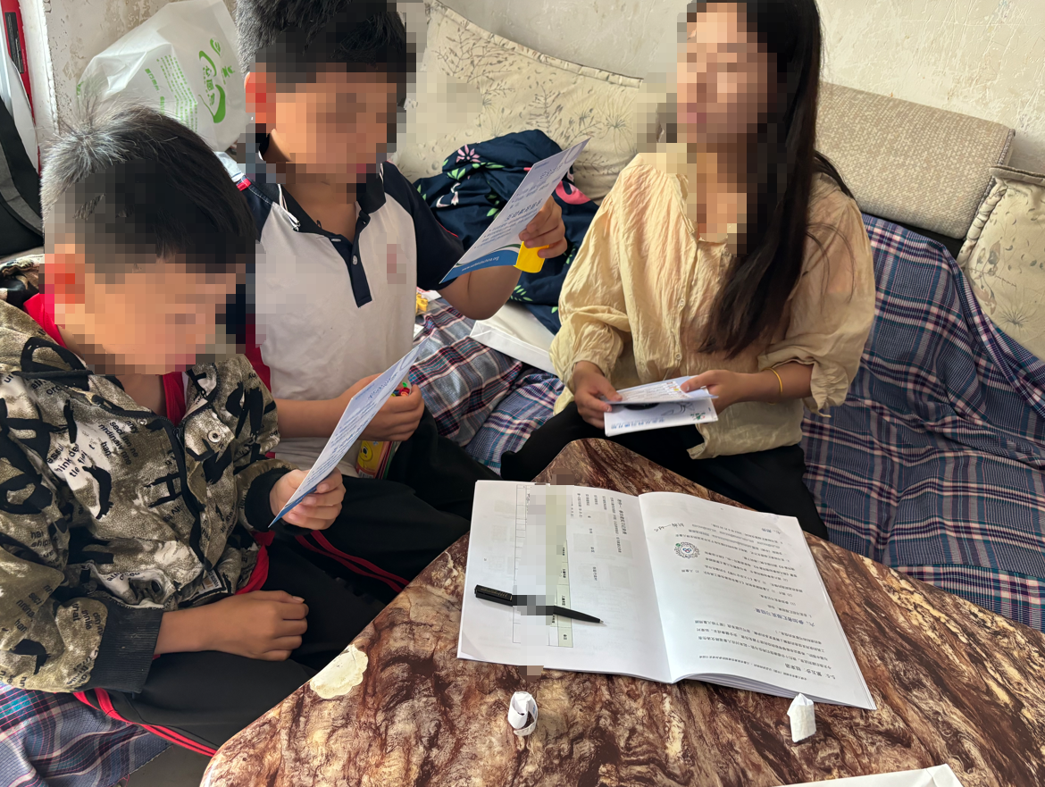 互动式学习与信息登记: 家访过程充满了积极的互动。照片显示,儿童们在全神贯注地观看溺水预防工具卡,并与讲师进行交流。同时,郭老师规范地引导儿童登记基本信息,为后续的跟进服务建立了档案。