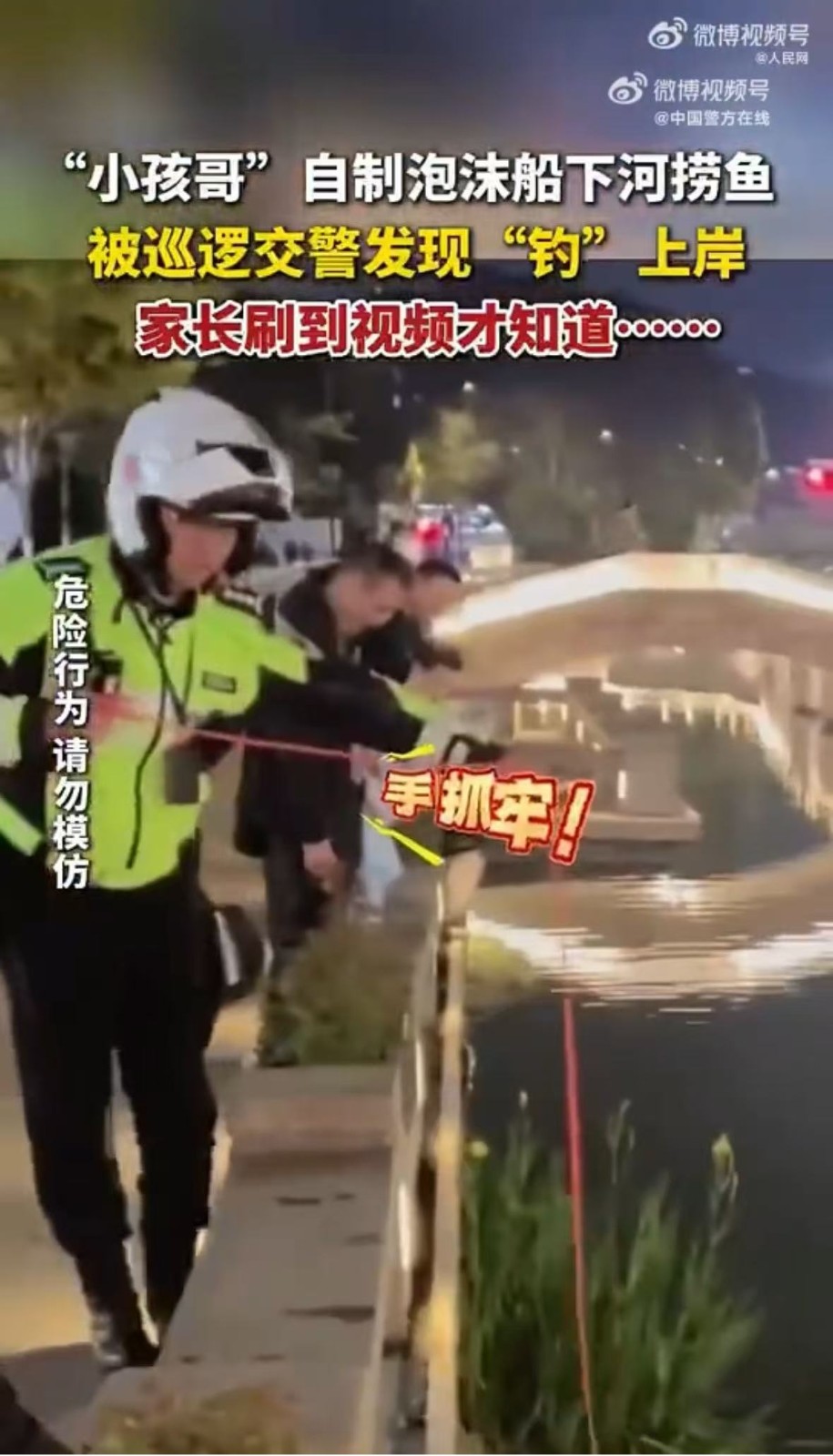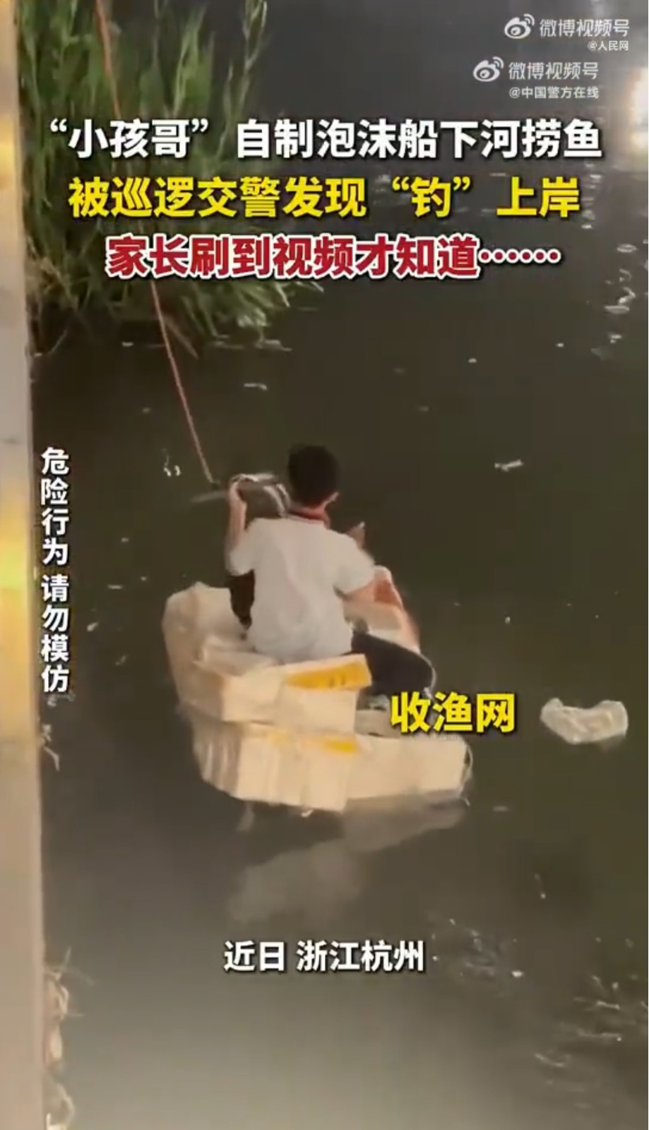近日,杭州,男孩自制泡沫船下河捞鱼,巡逻交警发现后,将孩子“钓”上岸。
