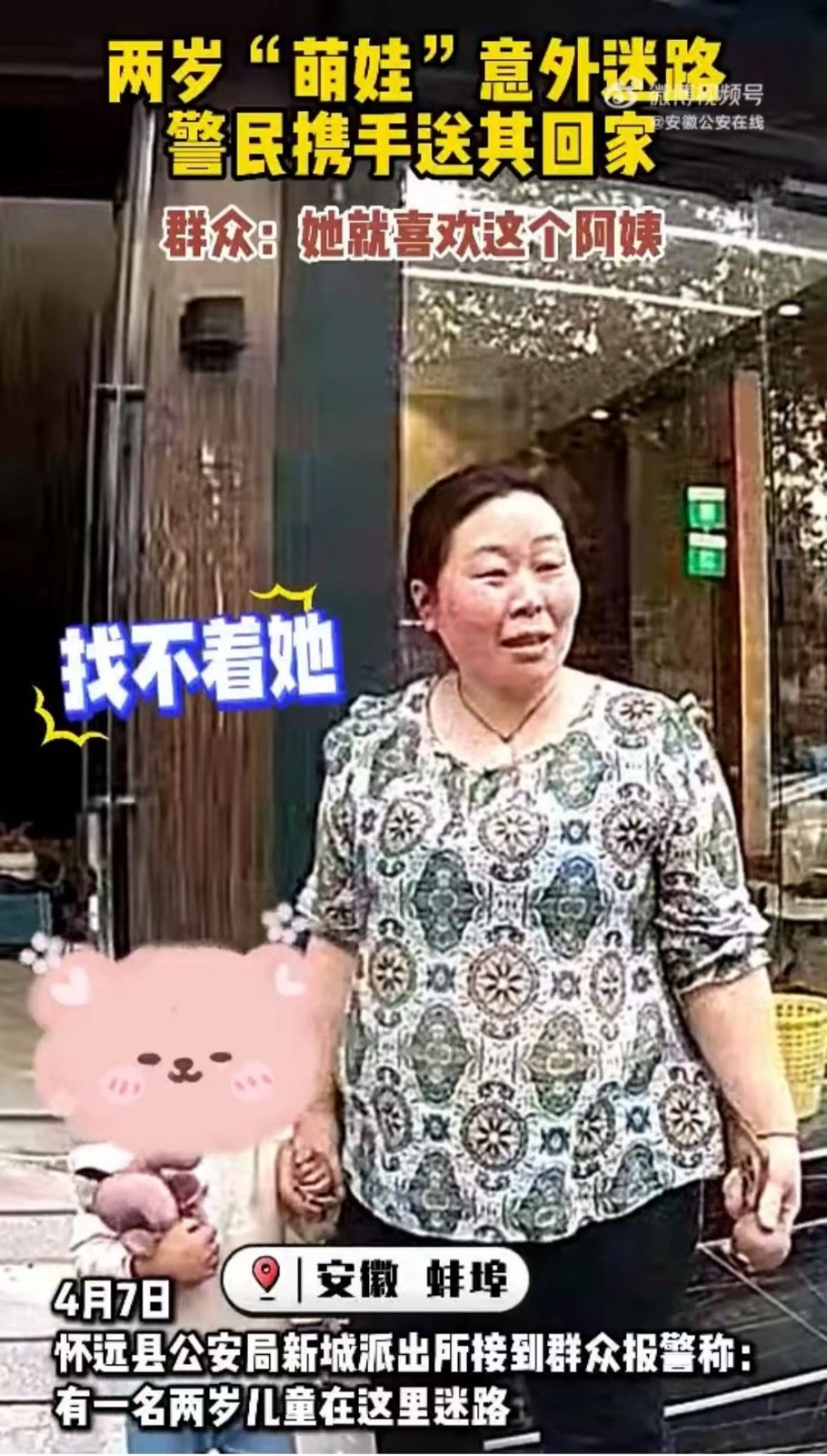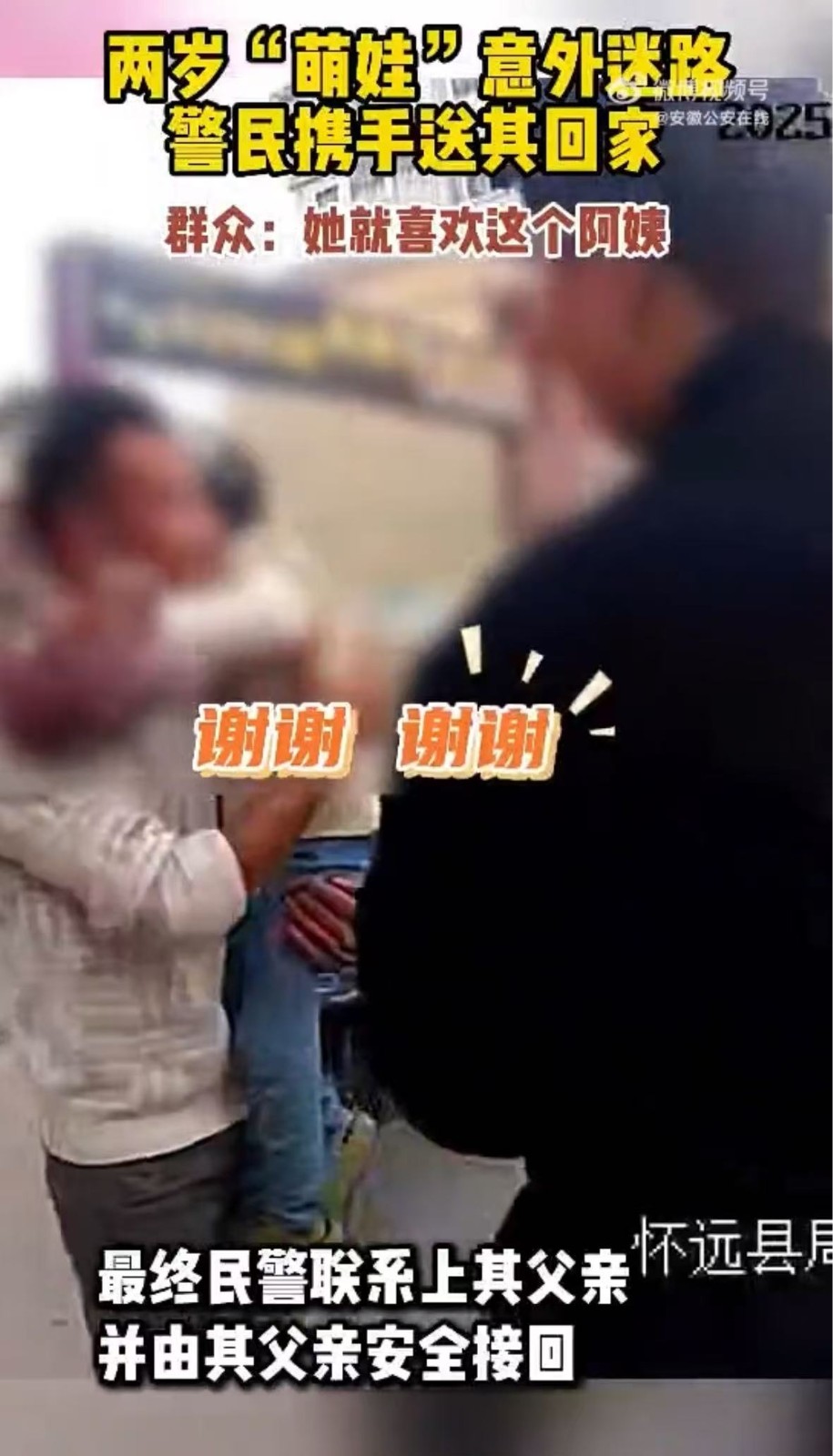 4月7日,怀远县新城派出所接到群众报警称:有一名两岁儿童在这里迷路。出警民警随即将女孩带上警车帮助其寻找家长。最终民警联系上其父亲,并由其父亲安全接回。