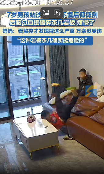 男孩沙发玩闹摔倒后脑勺磕碎茶几
