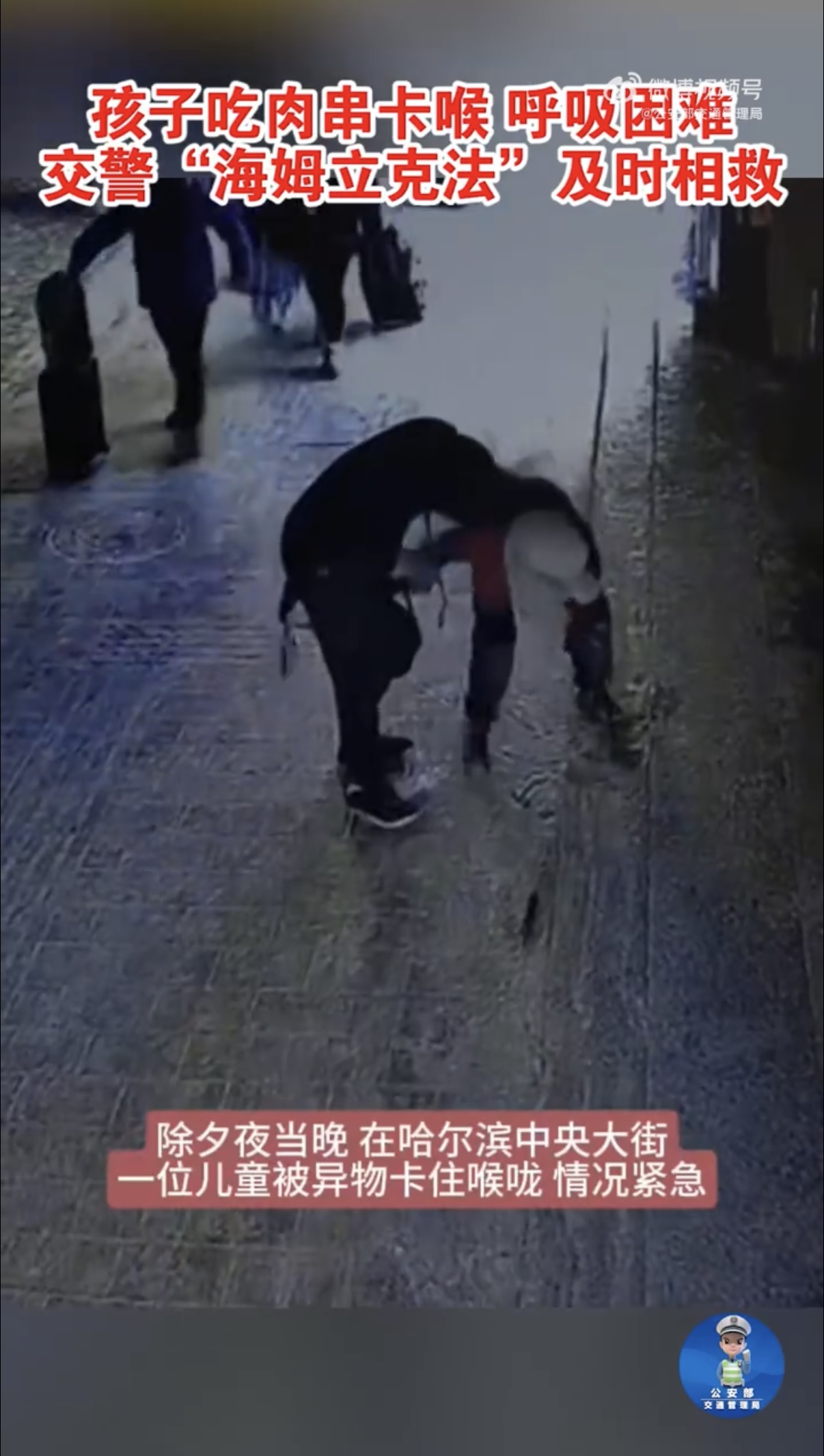 孩子吃肉串卡喉,交警“海姆立克法”及时相救